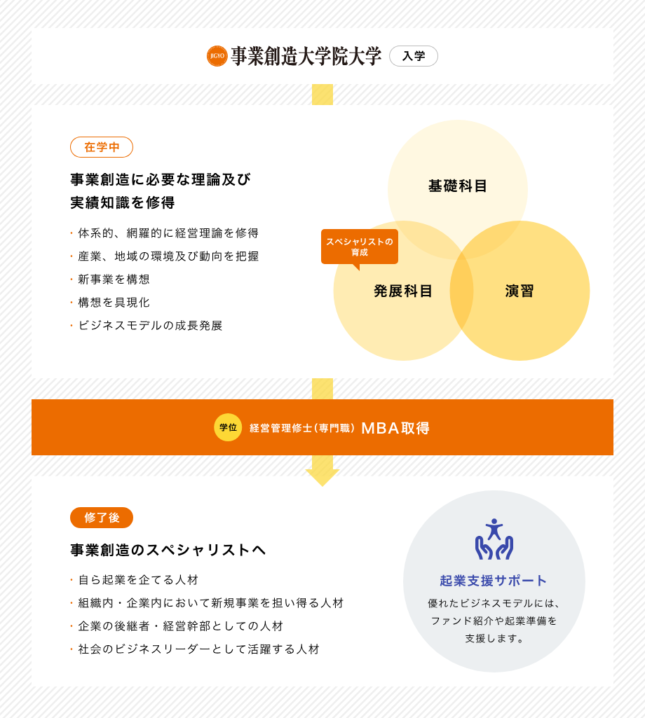 在本校,完成学业时可以撰写‘事业计划书’而非研究论文。通过‘商业计划书撰写法’的课程学习相关的知识,并通过个别指导或小班研讨的形式进行‘实习’,在毕业时将事业计划的可行性提升到实际可实施的水平。通过这一过程,可以培养新事业的策划能力和事业及组织的改革能力。